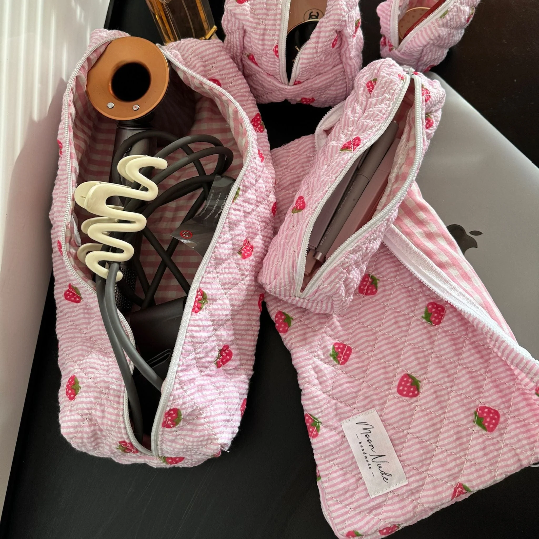 The quilted exterior features a beautiful strawberry-themed pattern, complemented by a classy pink gingham interior.